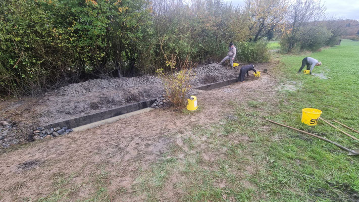 Helferinnen und Helfer tatkräftig für die Natur. Gemeinsam wurden die Unkenwannen und Weiher im Chilli gereinigt, Strukturhaufen angelegt und Hecken nachgesetzt.